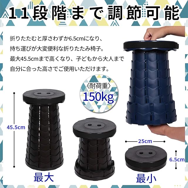 【商品詳細】 〈サイズ〉直径:25cm 、収納時高さ:6.5cm、11段階の高さ調節:6.5cm〜45.5cm 〈素材〉ポリマーポリプロピレン 〈本体重量〉990g 〈耐荷重〉150kg 〈カラー〉ブラック・グリーン・ネイビー・ブルー・グレー ※底面に製造過程において生じるスレキズが有ります。輸入品のため、元箱に凹みがある場合がございます。ご注意事項 ・海・川などでのご使用で水に濡れた場合は、水洗いして頂き良く乾かした上で、保管してください。汚れが落ちにくい場合は、薄めた中性洗剤をご使用ください。 ・本商品の上に、熱い鍋・やかん等の熱いものを直接置かないでください。 ・屋外でご使用頂いた場合、拭いてから保管してください。 ・高さ調整する際など、全てロックが掛かっているか、大人の方がご確認してください。(お子さんが高さ調整する場合など、ロックが掛かっていない等で怪我の原因になりますので、ご注意ください。)