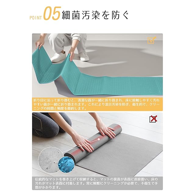 【細菌汚染を防ぐ】細菌汚染を防ぎ、従来の丸めたヨガマットよりも頻繁に掃除する手間が省けます。