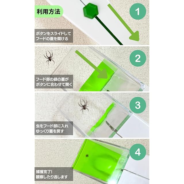 使い方は虫にフード部を被せて蓋のスイッチ部分をスライドさせるだけのかんたん利用。