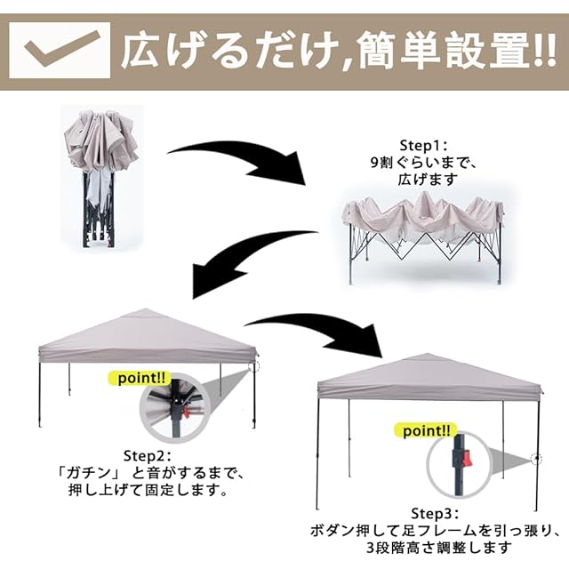 【設営も撤収も簡単!】 組み立ては広げて立ち上げるだけなので簡単。 ワンタッチボダンで押すだけで、固定が解除できる、撤収もらくらく!タープテントの支柱にある調節ボダンで、高さを2.36m /2.46m / 2.56mで3段階調節も可能です。