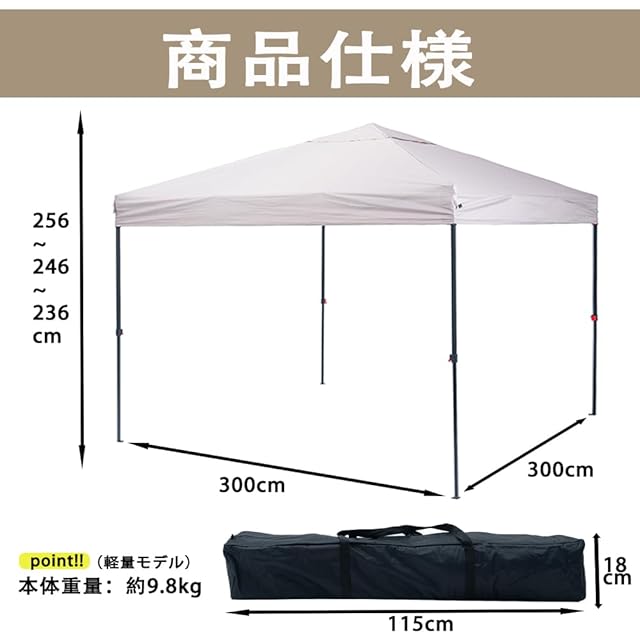 【商品詳細】サイズ 組立時 : (約)3.0m×3.0m×2.36m /2.46m / 2.56m 収納時 : (約)20cm×20cm×113cm 本体重量 :(約)10kg 材質 フレーム : スチール 生地 : 210Dオックスフォード 耐水圧 2,200mm以上 UVカッド率:97% (UPF50+) 付属品:サイドシート×3・ウエイトバック×4・ロープ×4 ・ペグ×8 ・専用収納ケース×1 ・取扱説明書(日本語)×1
