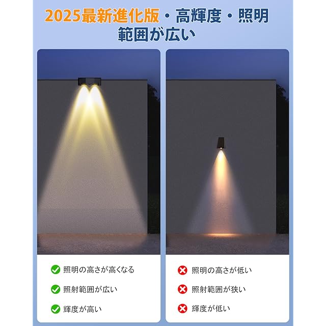 商品名:「2025新版高輝度」ソーラーライト 屋外 玄関ライト フェンスライト 7色/暖色 自動点灯 ガーデンライト 明るい LED 表札灯 表示灯 玄関灯 門柱灯 防水 広範囲 フットライト ウォールライト 照明 防犯ライト 取付簡単 庭 階段 通路 バックヤード (「暖色と7色変化式」4個セット)