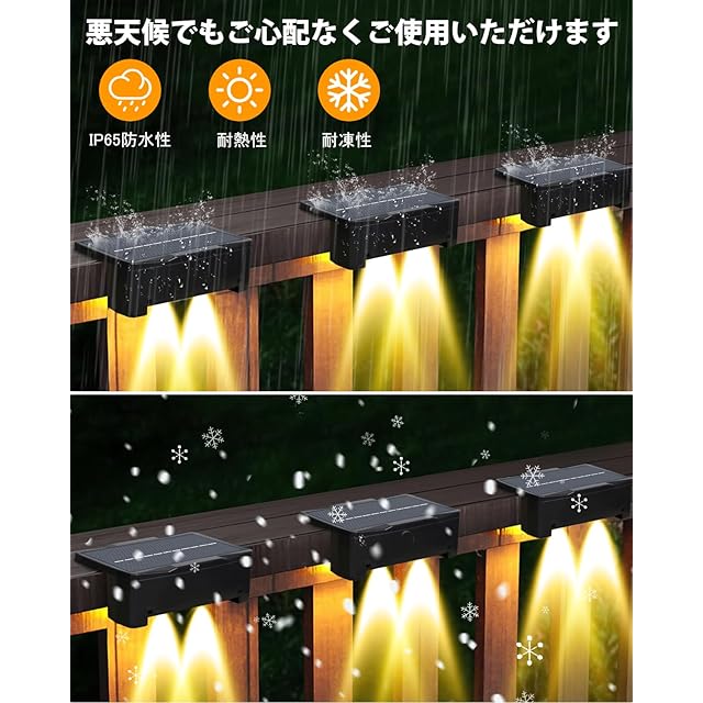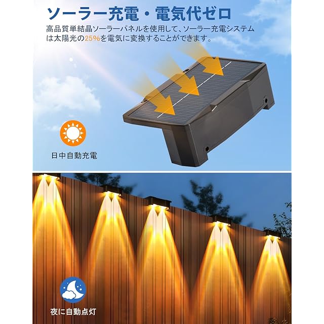 【ソーラーパネル・省エネ】このフェンスライトは、より効率の高い単結晶シリコンソーラーパネルを使用し、日中に自動的に充電します。ソーラー充電システムは、太陽光の 25%を電気に変換できます。 電気代を節約できるだけでなく、二酸化炭素排出量も削減し、環境にも貢献します。▲周りは明るくなると、ライトは自動消し、周りは暗くなると、ライトは自動点灯します
