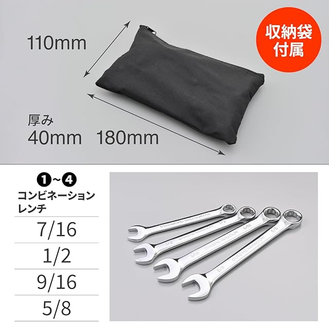 【商品構成】コンビネーションレンチ(7/16、9/16、5/8、1/2) へックスローブ(TORX)ソケット(T25、T27、T40、T45) 六角レンチ(1/4、3/16、5/16) バッテリー用コンビネーションレンチ(10mm) 3WAYプラグレンチ(16、18、20.8)、リバーシブルドライバー(+、-) プライヤー