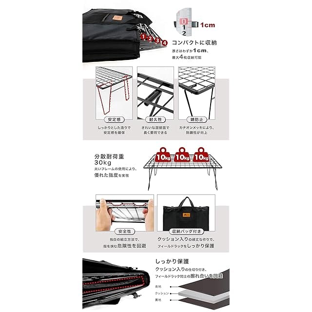 ★マルチに使えて高コスパ!激売れ中のフィールドラック。 ★収納も簡単でかさばらないフィールドラックはキャンプで意外と大活躍! ★復数を重ねたり並べたりするなど、色々な使い方ができるラックです。 【キャンプで大活躍】 キャンパーの間では、道具や材料を整理しておいたり、テーブル代わりに使用するなど、機能的で収納もコンパクトな人気のおすすめ製品です。 【コンパクトに収納】 フィールドラックがおすすめなのはその収納の良さです。足をたたむとほんとに薄い一枚の板の大きさになります。車の空きスペースに複数枚収納しておくことができます。 【耐荷重30kg】 耐久性や見た目が良いだけではなく、太い針金の使用により頑丈に出来ています。20kgの重いウォータージャグやクーラーボックスでも問題なく置けます。安定性アップの為、脚部を通常品より太くしております。 【収納袋付き】 傷や緩みに強い900Dポリエステル製、小物入れや生地の厚めの設計になっております。厚めのクッション入りで、フィールドラックをしっかり守ります。とても便利で長く使えます。