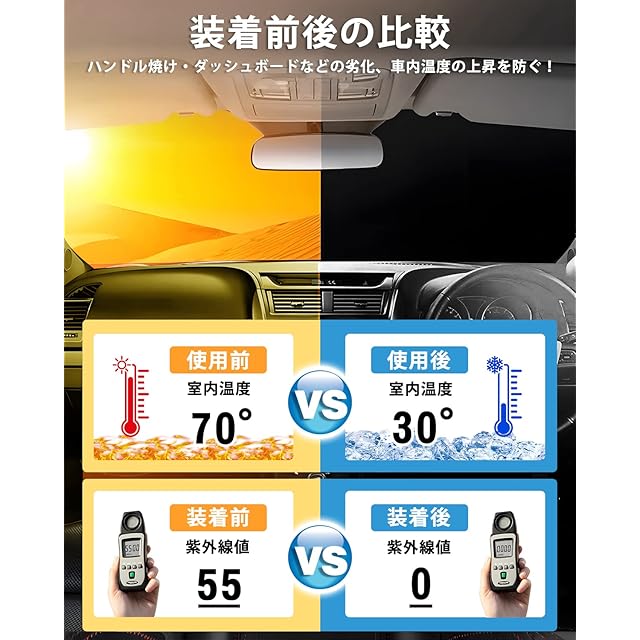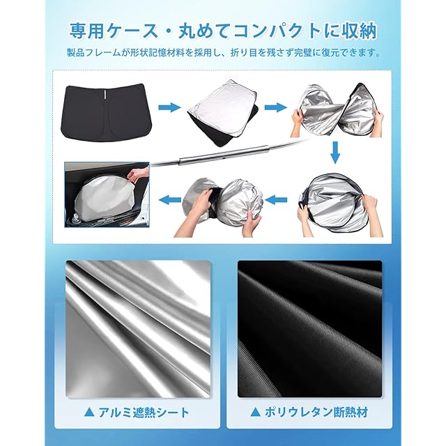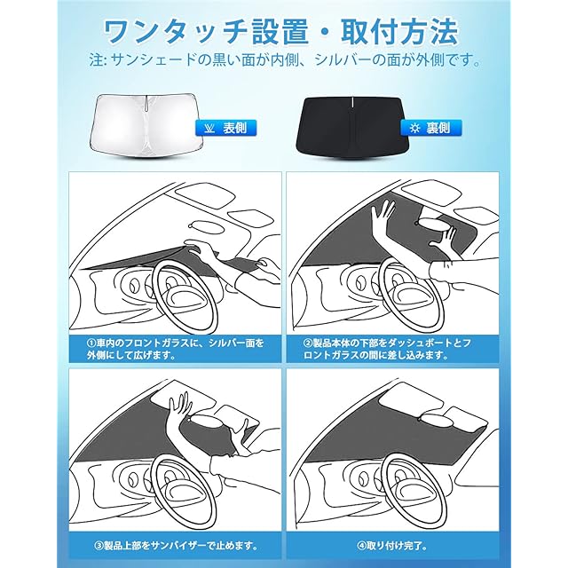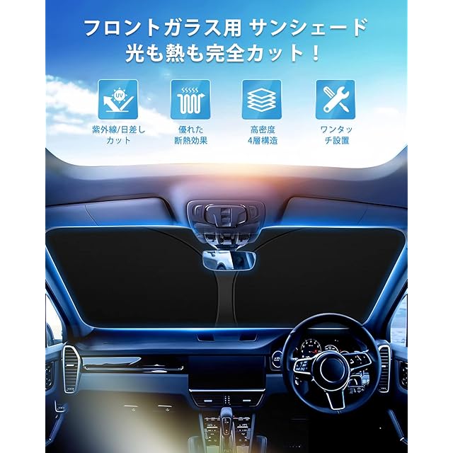 ✔3.【UVカット・断熱・内装劣化防止】①99%の有害な紫外線を効果的に遮断し、駐車時の大事な愛車を太陽光による損傷やハンドル焼け、ダッシュボードなどの樹脂部分の日焼けからを守る、使用寿命を延長します。②4層断熱材を採用し、車内の温度を軽減し、エアコンへの負荷がへり、省燃費が向上します。内装劣化防止、車内温度の上昇を防ぐサンシェード超おすすめ!