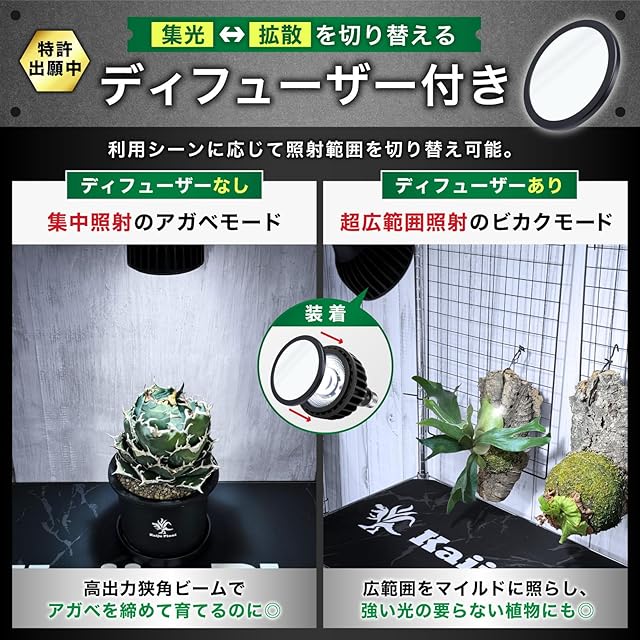 ✅【2つのモード】特許出願中のディフューザーを取り付けて、集中照射のアガベモードから光を拡散し広範囲をマイルドに照らすビカクモードへ 集光→拡 散をきりかえることができます ✅リフレクターが標準装備となりました(2025/05/30~)