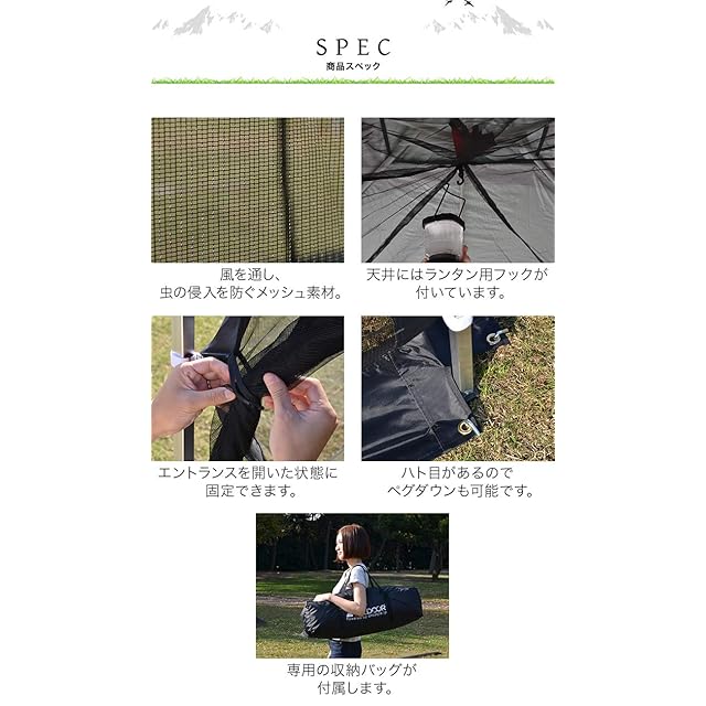 ✅【蚊帳のように虫除け対策にオススメ!4面フルメッシュのバグガードスクリーン】 虫除け対策にぴったりなバグガードスクリーンの登場です。 4面フルメッシュにすることで虫を気にせず快適に過ごすことができます。設置もフレームに引っ掛けるようにセットするだけなので、とっても簡単です。