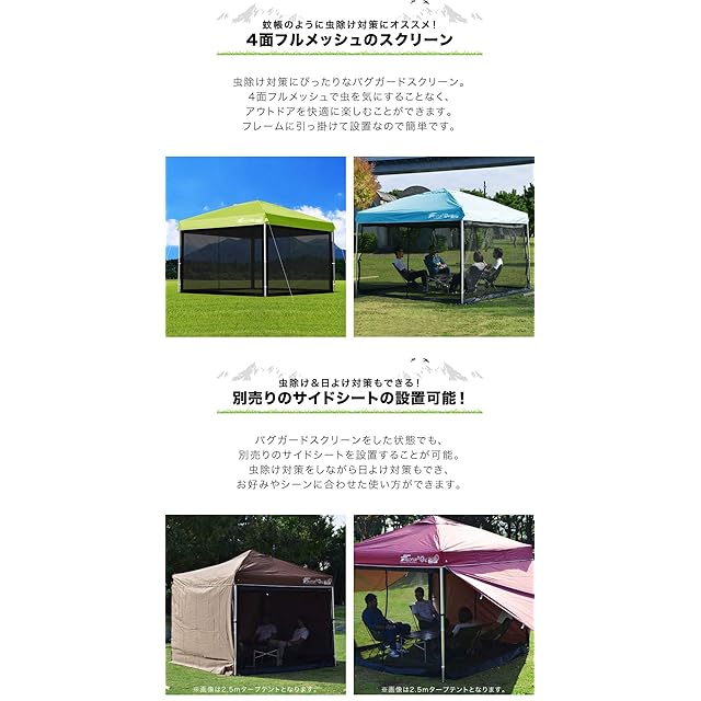 ✅【虫除け&日よけ対策もできる!別売りのサイドシートの設置も可能!】 バグガードスクリーンをした状態でも、別売りのサイドシートを設置することができるので、虫除け以外にも日よけ対策することもできます。お好みやシーンに合わせた使い方が可能。