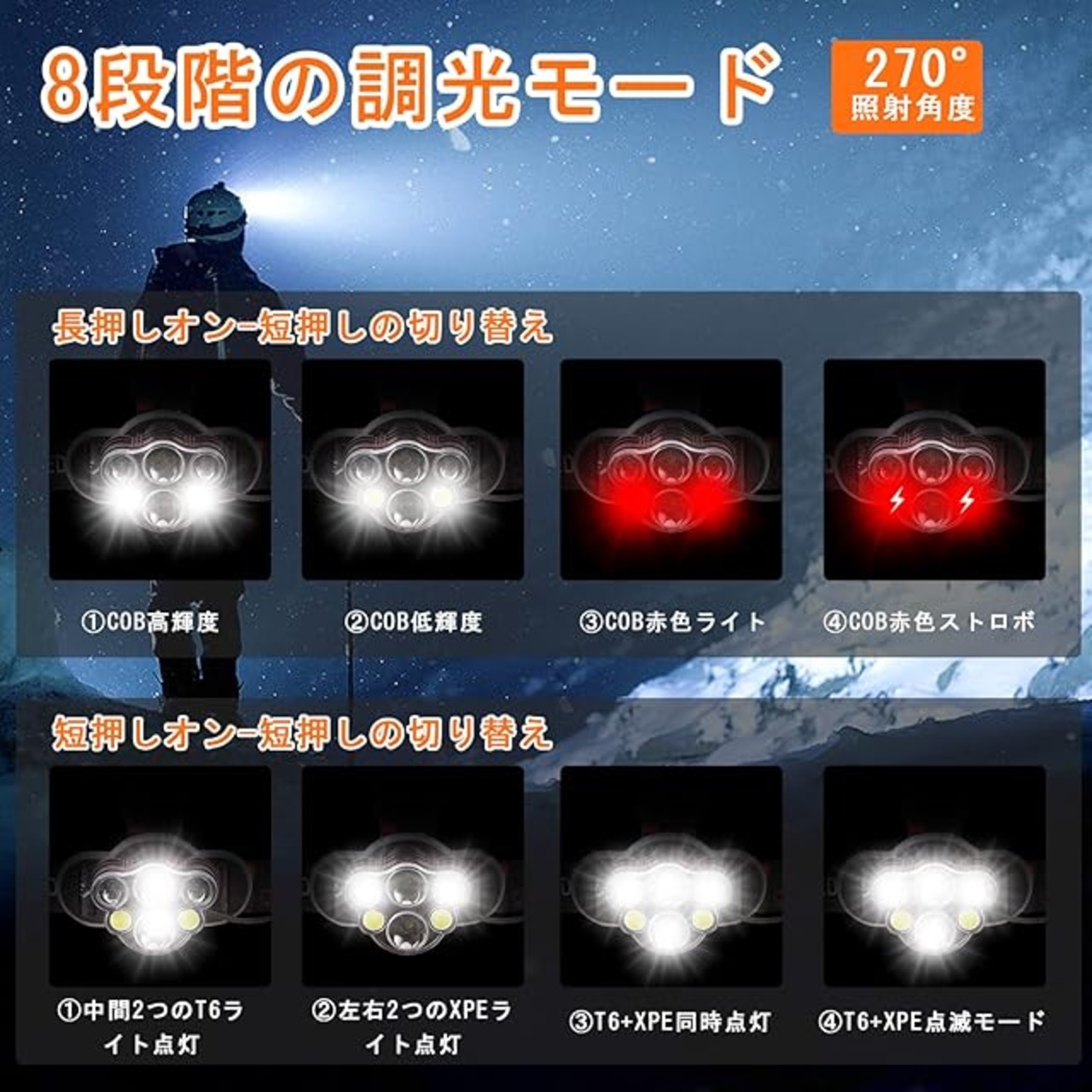 【8点灯モード・90°角度調整・テール警告灯】8つの点灯モード(レギュラー:強、中、弱 、点滅 COBモード:強、弱 、赤ライト、赤ライト点滅)があります、スイッチを押すだけで、適切な点灯モードを選択し、モードを切り替えることができます。点灯中に電源ボタンを3秒間押すと、COB点灯モードになります。90°の角度を自由に調整でき、使用環境に応じて適切な照射角度と照射範囲を調整し、危険を回避します。 テールLEDの赤色警告灯のデザイン(2つモード:常点灯、点滅)は、歩行者や後続車に気づかれやすく、夜間の歩行より安全になります。