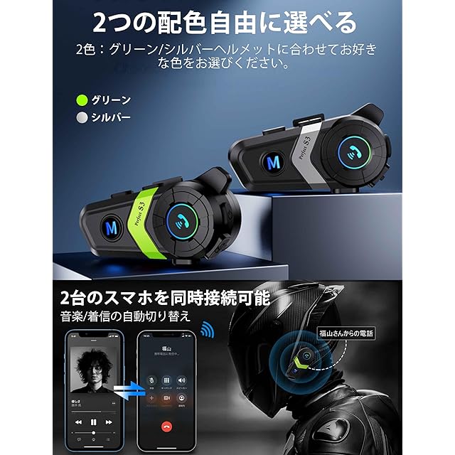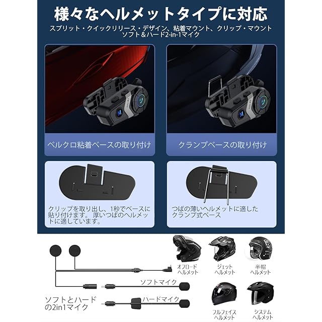 【粘着/クリップオンベース&2-in-1ソフト&ハードマイク】 S3インカムバイク用は、より多様なヘルメットタイプに適応するために、2-in-1ベースと2-in-1マイクを採用し、オフロードヘルメット、フルヘルメット、ハーフヘルメット、覆われていないヘルメット、すべてに適用し、複数のヘルメットを持つライダーの懸念も解決します。弊社のバイク ヘッドセット bluetoothは1年間の製品が付きます。 何か問題がございましたら、お気軽にご連絡ください! 注:バイクがスピーカーに正しく接続されていない場合、手動でスピーカープラグをバイクヘッドセット本体に挿入する必要があります。 そして、しっかりと接続されるように深く挿入する必要があります。 正常に接続されます。