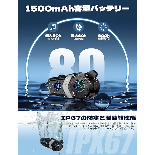 【大容量バッテリー&IPX7防水性能】 バイク用ヘッドセット内蔵の1500mAhリチウムバッテリーは電池寿命が長く、音楽通話は最大80時間、スタンバイ時間は600時間で、毎日の通話や音楽再生に対応し、より長い時間を聞くことができます。さらに、バイク イヤホンのメインフレームは、ABS+シリコンシーリング構造と防水シーリングリングの増加により、内部パーツを深く保護し、雨、雪、埃を恐れず、スムーズな走りを実現します。