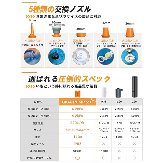 【幅広い用途に適した5つのノズル】- さまざまな形状やサイズに対応する5種類のノズルが付属しています。アウトドアで「このポンプは合わない!」という最悪な状況に陥ることはもうありません。ほとんどのエアマットレス、プールフロート、浮き輪、ヨガボール、子供のおもちゃに対応しているので安心です。さらに、真空バッグ用ノズルでスペースを60%以上節約可能できるので、旅行やキャンプだけでなく主婦の方にもオススメです。※ゴム風船やバレーボール等のボール、自転車のタイヤにはご使用いただけません。