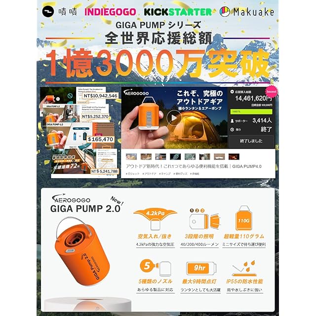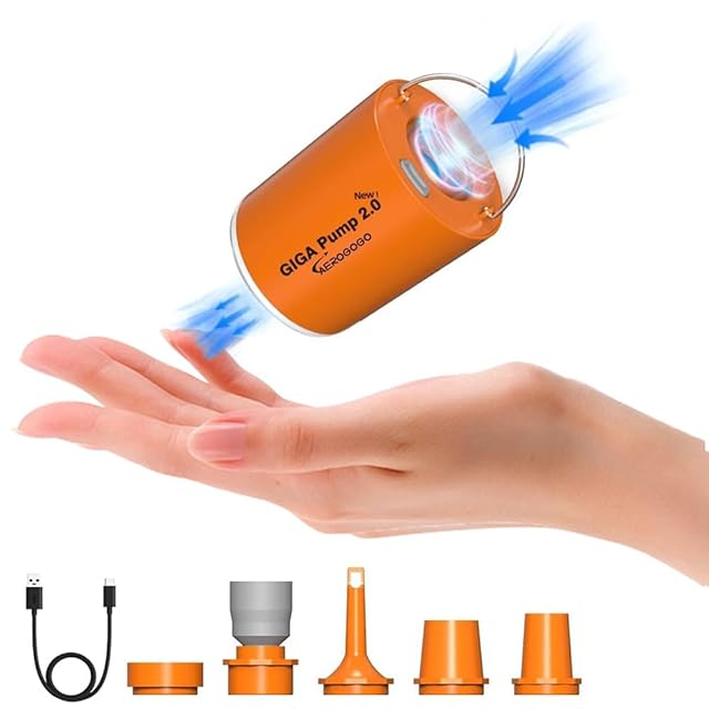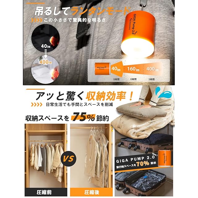 商品名:GIGA PUMP4.0 電動エアーポンプ 【超ハイパワー設計】4.2Kpa 220L/分 IPX4防水 特許取得済み デュアルワイヤーラッピング構造モーター 超軽量 100g 照明 ライト付き USB充電式 Type-C 急速充電 携帯型 キャンプ アウトドア テントライト エアーポンプ 空気入れ 空気抜き 衣類圧縮 真空収納 電動ポンプ (GIGA PUMP 2.0 New!, オレンジ)