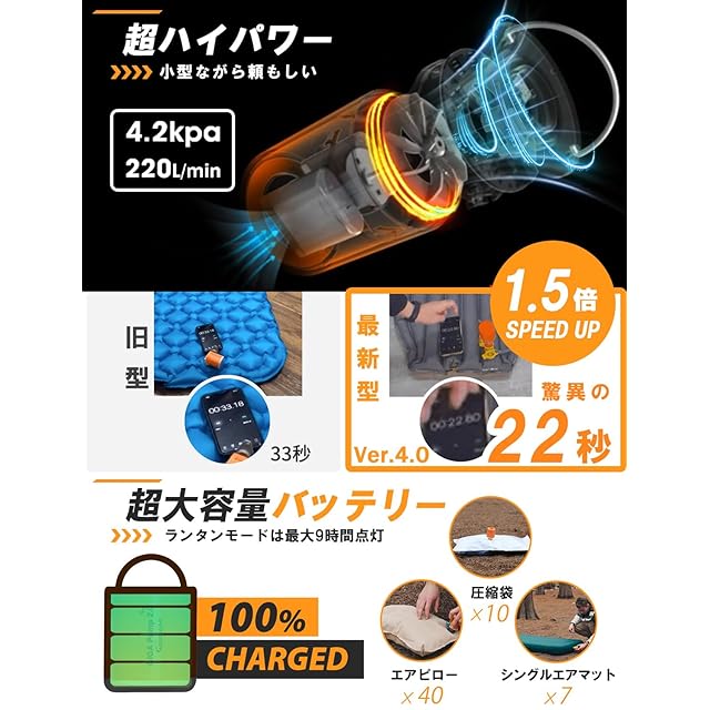 【超コンパクト&超ハイパワー設計】- 特許を取得したデュアルワイヤーラッピング構造モーターを採用し、コンパクトながら高性能なエアーポンプを実現。空冷設計をアップグレードしており、製品寿命も期待できます。最大4.2kPaの空気圧と220 L/minの驚異的な空気流量を提供します。目的地の山·川·海に到着したら、使いたい製品をサッと膨らませ、時間と体力を節約しましょう!