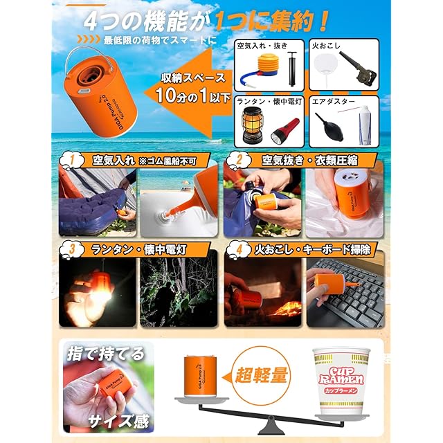 ✨【いつものキャンプ道具がこれ一つ】✨- 収納スペース10分の1以下。空気入れ・空気抜き・ランタン、火起こしや衣類整理、キーボード掃除が可能。荷物を最低限に抑え収納スペースを大幅に節約できるので、旅行やアウトドアに最適です。必要なものをコンパクトにまとめることができ、その分、他の荷物を載せることができます。多機能ながら、手のひらサイズでたったの100g!ワンボタン操作で、アウトドアや室内で幅広く活躍します。