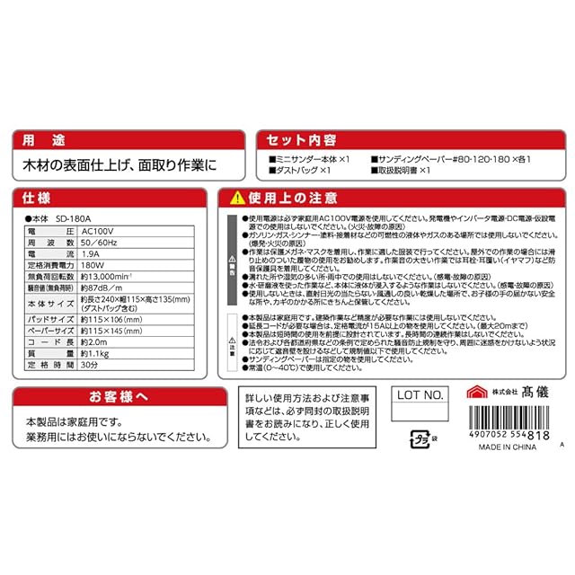商品名:高儀(Takagi) ミニサンダー EARTH MAN AC100V SD-180A【木材の表面仕上げ、面取り作業に】【片手サイズ】【ペーパー3種付属】 サンダー 工具 電動サンダー 電動ヤスリ オービタルサンダー サンドペーパー 木材研磨