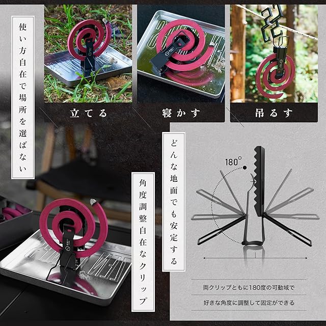 【機能性】蚊取り線香を装着して立てる、寝かす・吊るすことが可能で、色々なシーンで活躍します。蚊取り線香の火が途中で消えることなく最後まで使えます。