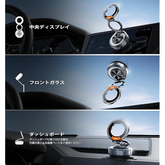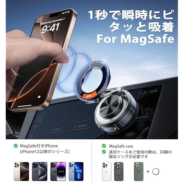 【幅広い対応機種&簡単取付け】For iPhone 16/15/14/13/12シリーズをはじめ、MagSafe対応のすべてのデバイスに対応。MagSafe非対応のスマートフォンでも、付属のマグネットリングを使えば、しっかり固定できます。取り付けはとても簡単で、片手でパッと装着可能。わずか数秒でセッティングが完了します。さまざまな車種にフィットし、どんなスマホでも安定したホールドを実現します。