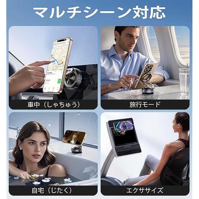 【マルチに使えて、ハンズフリーで快適】強力な吸盤ベースとマグネットで、さまざまなシーンに対応する万能スマホホルダーです。 運転中はもちろん、ワークアウト中や料理中、さらにはバスルームでもハンズフリーでスマホを固定できます。360度回転に対応しており、縦・横の切り替えもスムーズ。TikTokやInstagramなどのコンテンツ撮影にもぴったりです。