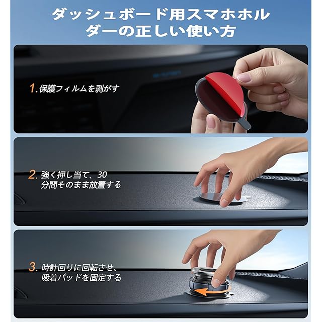 【重要:対応可能な取付け場所について】本製品(真空吸盤式の車載スマホホルダー)は、フロントガラスやセンター画面、ツヤのあるダッシュボードなど、平らで滑らかな面への取り付けに適しています。ザラザラした面や一部のダッシュボードには、付属の粘着パッドをご使用ください。※ご注意:曲面や凹凸のある面、不規則なレザー素材などには取り付けできません。鏡面、ガラス、ディスプレイ、ホワイトボード、滑らかな金属、大理石など、つるつるした表面であれば、しっかりと固定できます。