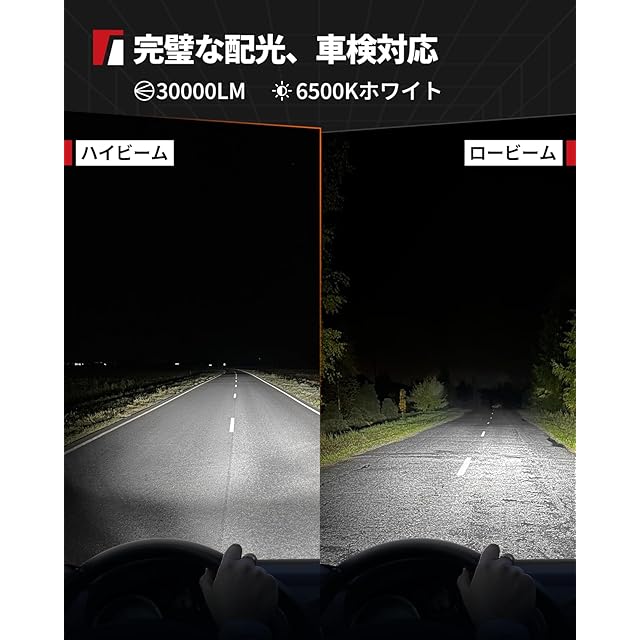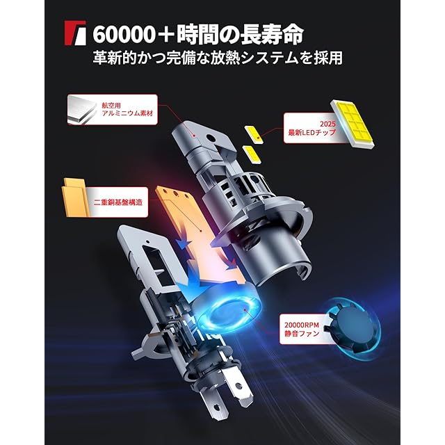 【60000時間の長寿命】ヘッドライト本体は航空機グレードのアルミボディを採用し、LED基板の下が最高熱伝導効率の銅板を内蔵され、さらに14,000 RPMの静音ファンを搭載して、最大限度放熱面積増を増やして、密閉空間の急速冷却が可能です。この三重放熱システムにより、 60000 時間以上の寿命をするのに役立ちます。