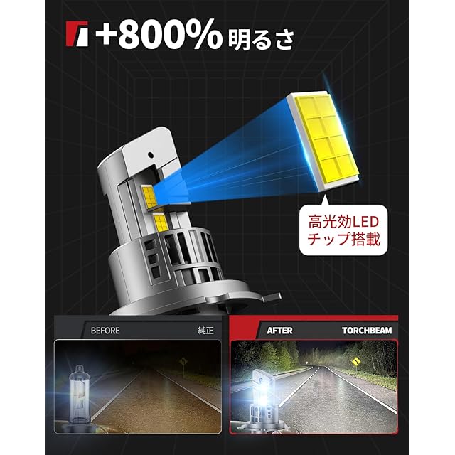 【30000LMの爆光モデル】Torchbeam T1S h4ledは30000ルーメンを持つ最新一体型の車用ヘッドライトです。最先端のCSPLEDチップを採用して、伝統的な爆光を引き続け、20W*2のハイパワーで、純正より明るさは800%以上で、従来品よりも遥かに越えています。6500Kのホワイトがおしゃれで視認性も抜群!圧倒的なホワイトの光で、お車もオシャレに大変身!高精度の配光技術を採用し、光の分布を均一にします。車検対応、対向車等周りにも迷惑な眩しさが無くなります。なお、つける時にLEDチップを3時と9時の方向に向いで調整してください。