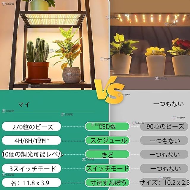 【調整可能な明るさ】この成長光には調整可能な明るさがあり、10レベルから100%の10レベルの調光オプションを提供します。さまざまな植物の照明要件を満たすために、植物が成長する理想的な照明環境の明るさを簡単に調整することができます。