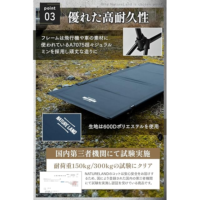 ✅【内容・商品詳細】当商品は日本国内にて厳正な検品を行っておりますが、万が一不良等ございましたら弊社までご連絡ください。 〇ブランド:NATURE LAND 〇展開サイズ:(ハイ)約1900×900×380mm (ロー)約1900×900×180mm 収納サイズ:約550×220×150mm 重量:約3.2kg 〇素材:A7075超々ジュラルミン(構造部材) , 600Dナイロン(張り材) 〇耐荷重:150kg ※ご利用の際は取扱説明書をよくお読みください。