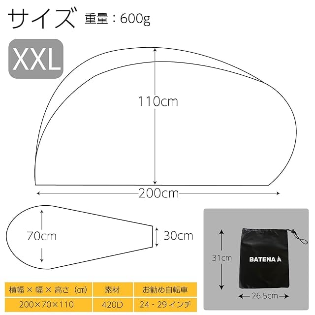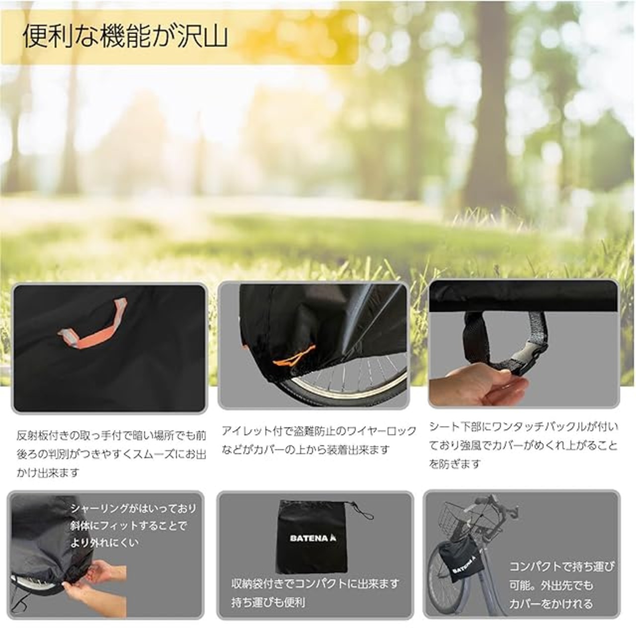 【あらゆる車種に対応】通常の自転車、電動自転車は勿論、ロードバイクやマウンテンバイク、クロスバイクやミニベロなど、幅広く対応したバテナの自転車カバーです。Lサイズ(180×60×90/18-24インチ)・XLサイズ(190×65×98/20-26インチ)・2XLサイズ(200×70×110/24-29インチ)と3サイズを選択できます!