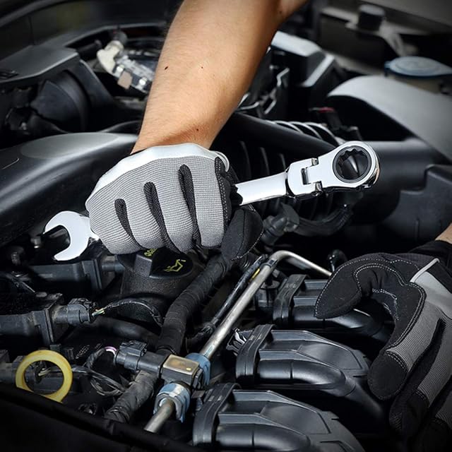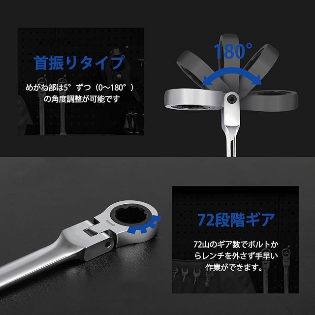 【使い勝手良い】メガネ部分が首振りタイプで0~180°角度調整できて、障害物を避けたり、持つ手のスペースも確保できます。12角サーフェスでボルト・ナットの角を舐めにくくて入りやすくて、ラチェット部に回転方向を示す矢印があり更に便利です。