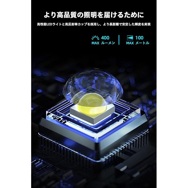 高性能のLEDを採用し、最大輝度400ルーメンの明るい光を放ち、最大照射距離は100メートルに達します。暗闇でも広範囲を明るく照らし出すことができます。狩猟、サバイバル、災害対策、仕事、旅行、捜索などの場合にも大活躍です。