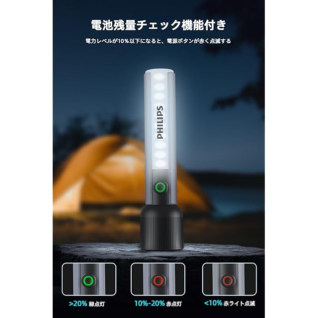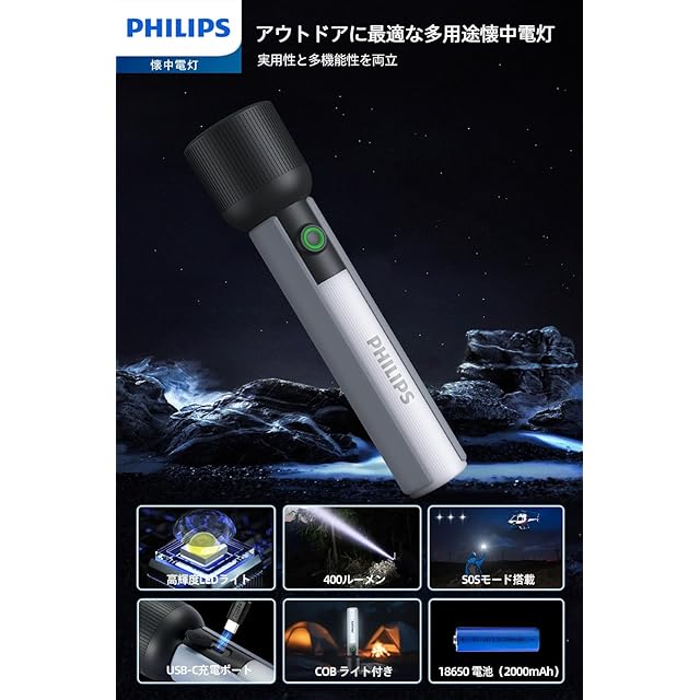 Philips(フィリップス) led ライトCOB 懐中電灯 高輝度 400ルーメン フラッシュ 5つ調光モード/Type-C充電式/低電量提示 IP44防水 ハンディ 18650 キャンプ/防災/停電対策/夜間散歩 SFL1183