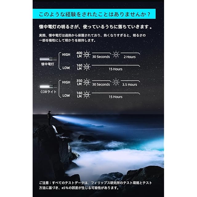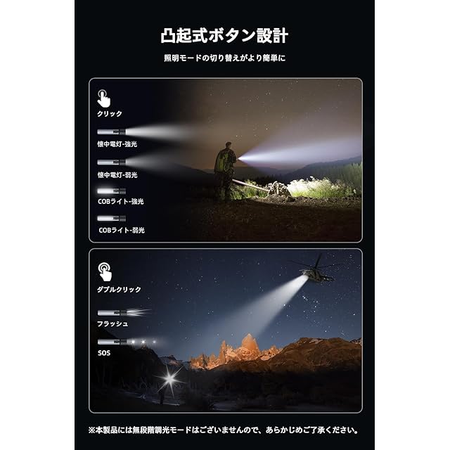 【5つ光モード切替】強光、弱光、COB、フラッシュ、SOSの5つ光モードを備えています。弱光モードでは連続点灯時間が最大約15時間に達するため、災害時の避難生活でも電力切れを心配することなく長時間使用することができます。操作方法は、順番にクリックすると強光から、弱光、COBの強光、COBの弱光までに切替ります。ダブルクリックで点滅モードとSOSモードに切り替えることもできます。