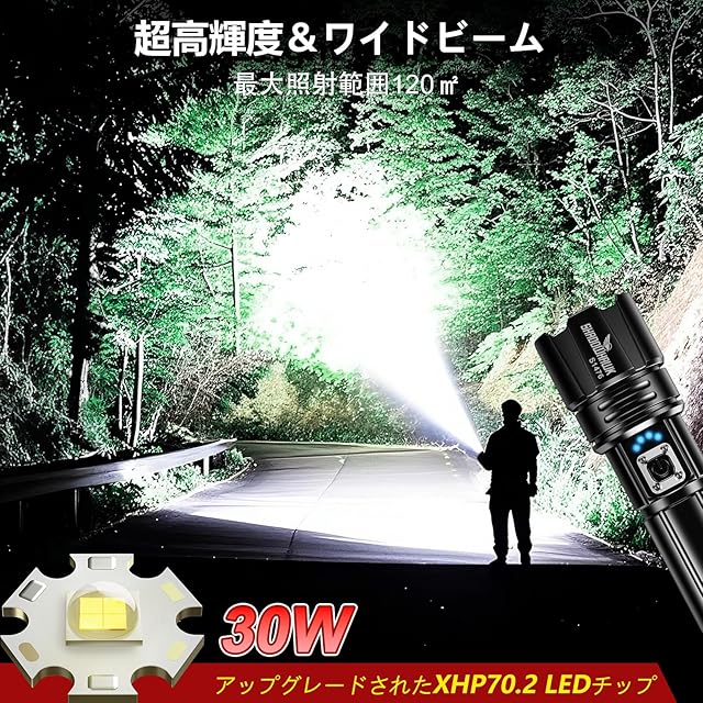 懐中電灯 かいちゅうでんとう led 強力 軍用 最強 Shadowhawk 超高輝度 30000ルーメン フラッシュライト 充電式 ハンディライト XHP70.2 超強力ライト 電池式 ハンドライト flashlight 明るい IP67防水 5モード調光 ズーム調整可能 防災/登山/夜釣り/地震/災害/停電対策/非常灯にも使用可能 (大容量26650充電式電池と3*AAA電池付き)