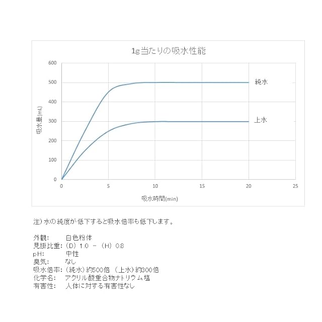 ○適用pH:5~9 ○吸水時間(1g当):水50ml→20秒、100ml→1分、300ml→3分、500ml→10分