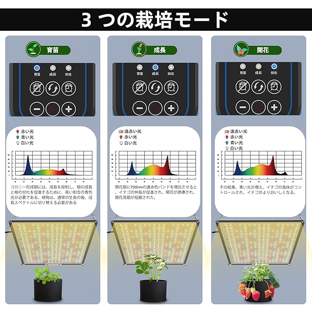 【 timer/亮度調整範囲広】植物育成灯は、智能コントローラーを搭載し、操作が簡単で、亮度調整範囲は10%から100%まで可変です。灯は「苗」、「成長」、「結果」の3つの育成モードを選択できますが、植物のさまざまな育成期間に必要な最適な光線を提供します。 timerの記憶機能は、0~23:59までの設定時間で自動的に灯の操作を切り替えることができます。植物を安定し、精巧な照明で育ててください。新しいパネルの設計理念は、初心者にとって便利で、パフォーマンス、品質、経済的です。
