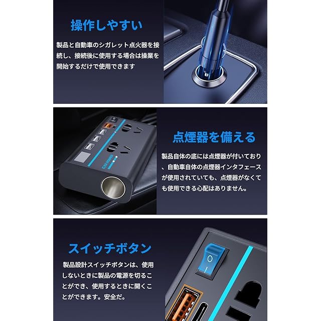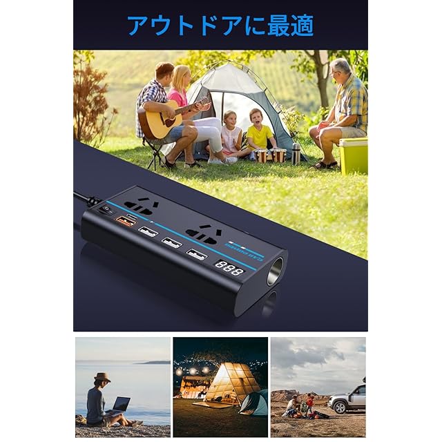 【複数の電気製品に適用】この車 インバータは多機能設計思想を採用し、2AC+3USB+QC3.0+PD+シガーライターポート出力を一緒に組み合わせ、合計8ポート出力があります。 また、シガーライター延長ポートにより、いつでも車載機器を接続することができ、複数の機器を同時に充電することが可能で、アウトドアオフィス、エンターテイメントなどのニーズに対応できます。「スイッチはソケットポートのオン/オフのみを制御し、USBポートの電源オン/オフは制御しません。」
