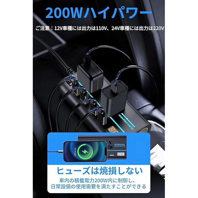 商品名:インバーター 200W カーインバーター DC12VをAC110Vに変換 コンバーター 電圧表示 シガーソケット 8ポート 車載用充電器 超軽量 コンバーター 車 車載用インバーター 12V全車種対応 修正正弦波 ブラック