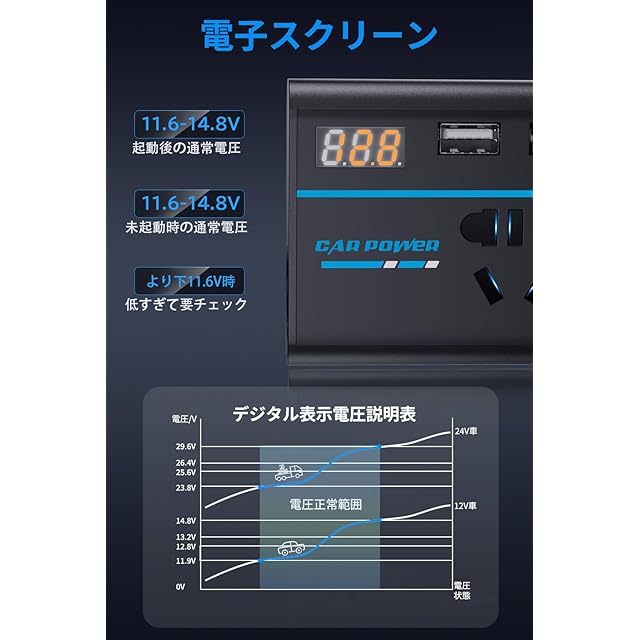 【一目瞭然の電圧表示】 車用インバーターには高精細LCDディスプレイが搭載されており、電圧やその他の重要なデータをリアルタイムで表示し、デバイスの動作状況を把握することができます。 内蔵のスマートチップは、異なるデバイスが必要とする電圧を自動的に識別し、マシンを損傷することなく安全に充電することができます。 さらに、ユニークな放熱設計とインテリジェント静音ファンにより、インバーターは長時間の運転中も涼しく静かで、より安心して使用できます。