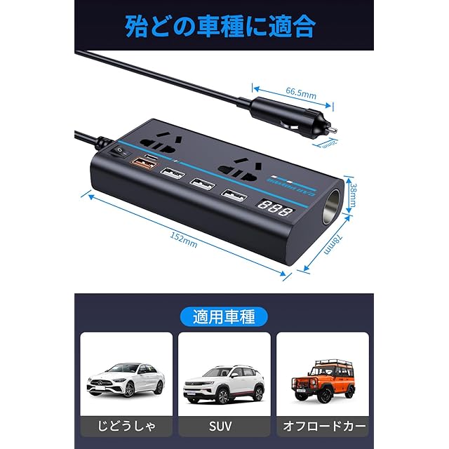 【DC12VをAC110Vに変換】DC12VはAC110Vに変換できるので、12Vの車種に対応でき、ディーゼル車でも電気自動車でも、異なる電力需要に簡単に対応できます。安定した性能により、過酷な環境下でも信頼性の高い電源サポートを実現し、非常時の電源ニーズに対応できます。