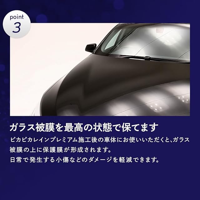 ピカピカレインプレミアム施工後の車体にお使いいただくと、ガラス膜の上に保護膜を作ることで、小傷等のダメージを軽減できます。