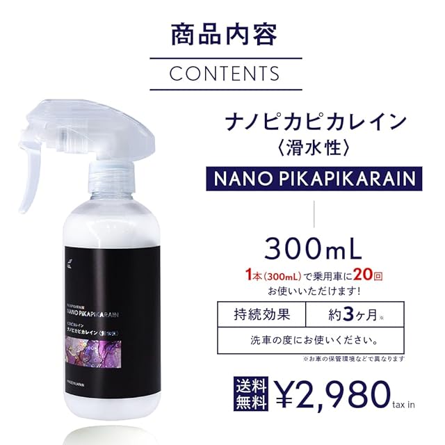ナノピカピカレイン 〈滑水性〉トップコート ガラスコーティング メンテナンス剤 【 高耐久 滑水 大容量 300ml 】 車 ガラス コーティング 自動車用 ボディ 汚れ 洗車 水 ワックス 日本製 [TOP-KMAINTE] | Trend Design BASE店