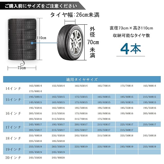 【収納バッグ付き】タイヤカバー直径73cm*高さ110cm、外径70cm未満のタイヤ4本を収納可能。収納バッグ付き、使わない時、収納袋に入れて、コンパクトで持ち運び安くて、スペースもとらないです