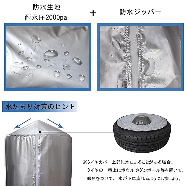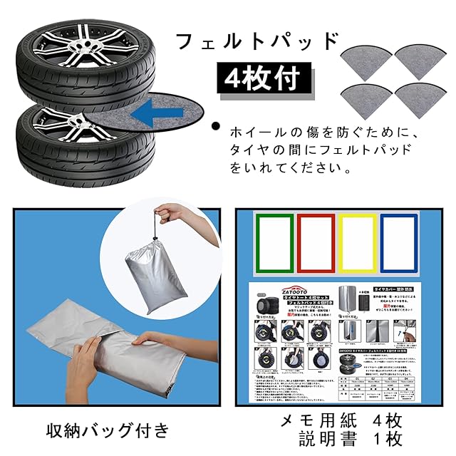 商品名:ZATOOTO タイヤカバー 屋外 フェルトパッド4枚付き タイヤ 4本 収納 保管カバー 420D 厚手 防水 紫外線 劣化 汚れ防止 耐久 SUV用 収納袋付き (15/16/17/18/19インチ) シルバー LYLTZ04-S