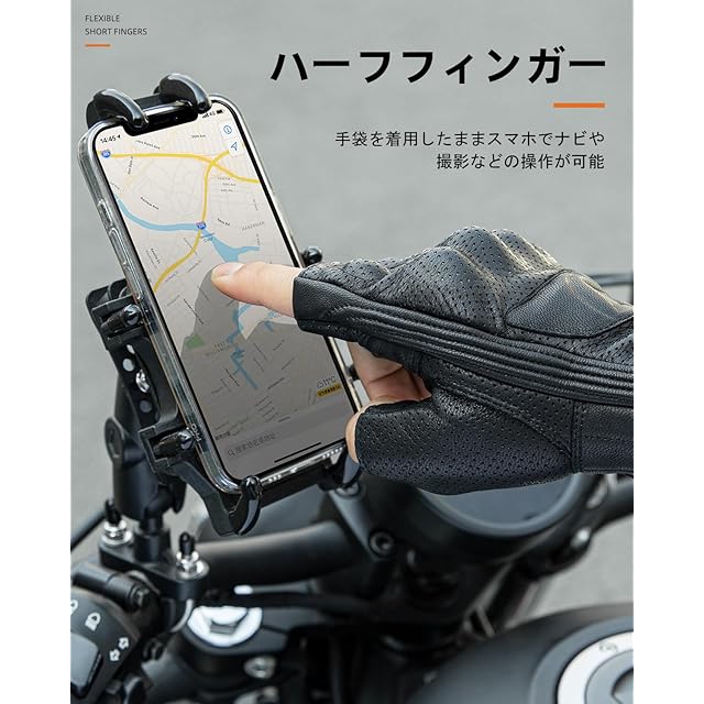 【うれしいポイント】①ハーフフィンガーグローブとして、グローブを脱がないままスマホでナビや撮影などの操作ができます。②手首部分には調整できるマジックテープを使ってフィット感の調整が可能です。また、着脱する時にも便利。③バイク用グローブの裾口にはスナップボタン付きで、左右のグローブをまとめておけます。④手袋の縫製もしっかりして、糸口がなく耐摩耗性もよく長く持ちできます。