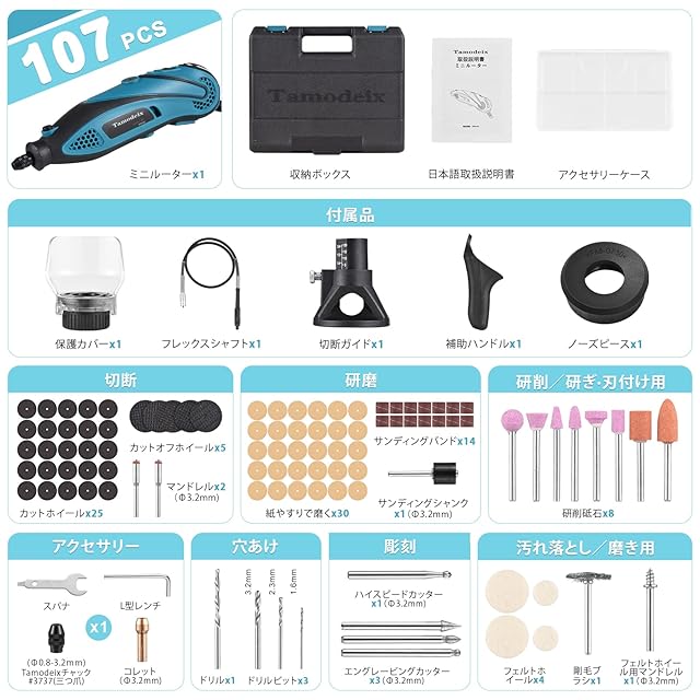 Tamodeix ミニルーター 三つ爪チャック リューター 無段階変速 最大32,000回転/分 107ピース入り 保護カバー 補助ハンドル ケース付き 日本語取扱説明書付き | Trend Design BASE店
