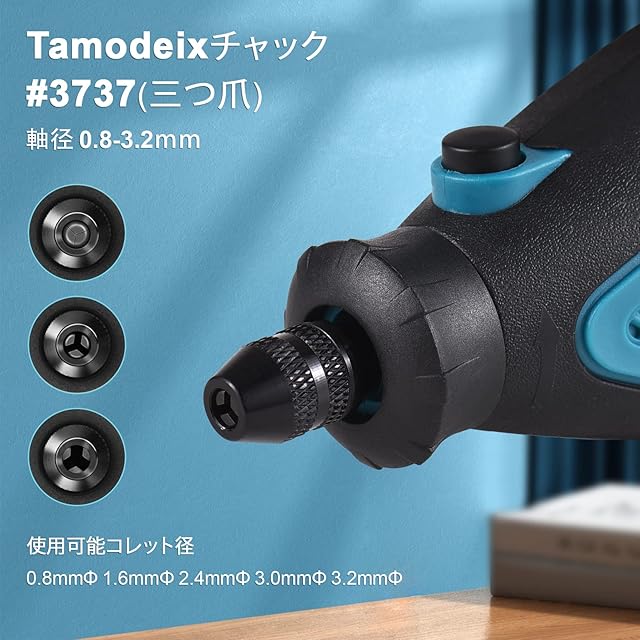 商品名:Tamodeix ミニルーター 三つ爪チャック リューター 無段階変速 最大32,000回転/分 107ピース入り 保護カバー 補助ハンドル ケース付き 日本語取扱説明書付き