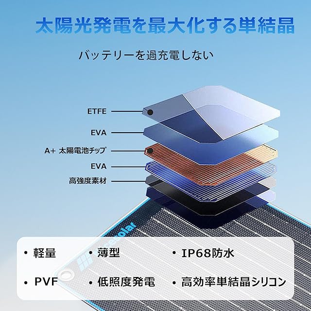 【完全防水素材】ETFE素材は、防水、防塵、屋外での使用に適していることができます。内蔵のブロッキングダイオードはまた、逆放電を防ぐことができる、バッテリーに害はありません、あなたはすべての時間にバッテリーにこの太陽トリクル充電器を接続することができます。