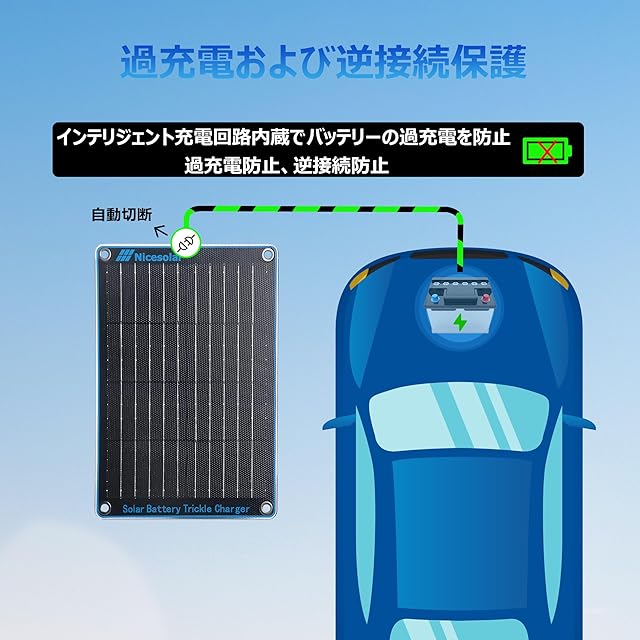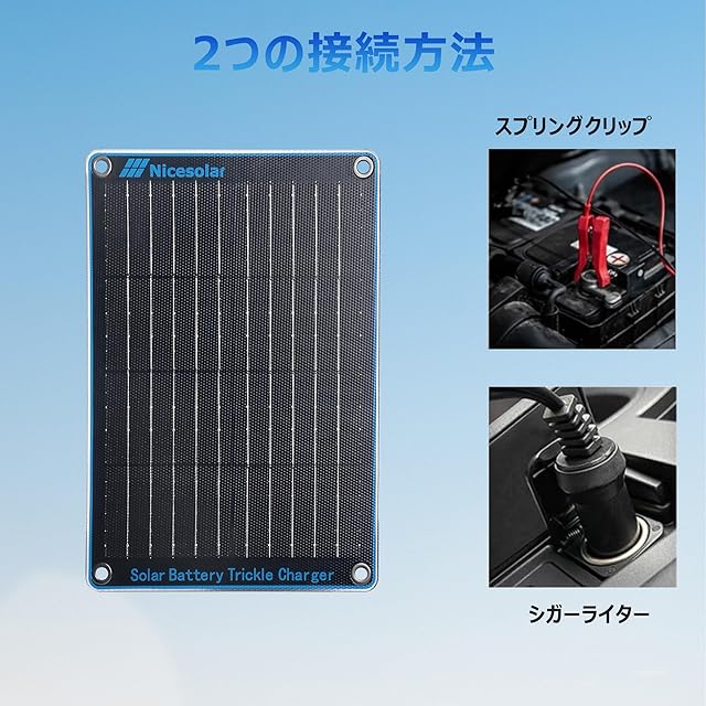 <b>ソーラー・トリクル・チャージャーを持つべき理由とは?</b> <br>- バッテリーの自然放電 - 車両を使用していないとき、バッテリーは自然に放電されます。<br>- ほとんど使用しないが、常にバッテリーを使用している車両 - 最近の車両は、バッテリーを徐々に消耗させる機器が多いため、1~2週間、車両を使用しないか、ほとんど使用しない状態でいると、バッテリー上がりを起こし、車両の始動が困難になることがあります。 <br>- バッテリーを充電しておかないと、バッテリーの寿命が短くなる - 12Vバッテリーは、12.4V以上に適切に保たれていないと、寿命が短くなります。 <br> <br>パッケージ内容 <br>1 x Nicesolar 10Wソーラーバッテリーチャージャーメンテナー <br>1 x DC to シガーライタープラグケーブル <br>1 x DC - ワニ口クリップケーブル <br>4 x サクションカップ <br> <br><b>注意してください。</b> <br>ソーラーバッテリーチャージャーメンテナーは、バッテリーの自己放電を補うためのものです。フル充電の際はこれに頼らないでください。 <br>車種によっては、イグニッションをオフにするとシガーライターポートが作動しない場合があります。その場合は、ソーラーバッテリーチャージャーメンテナーを直接バッテリーに接続してください。